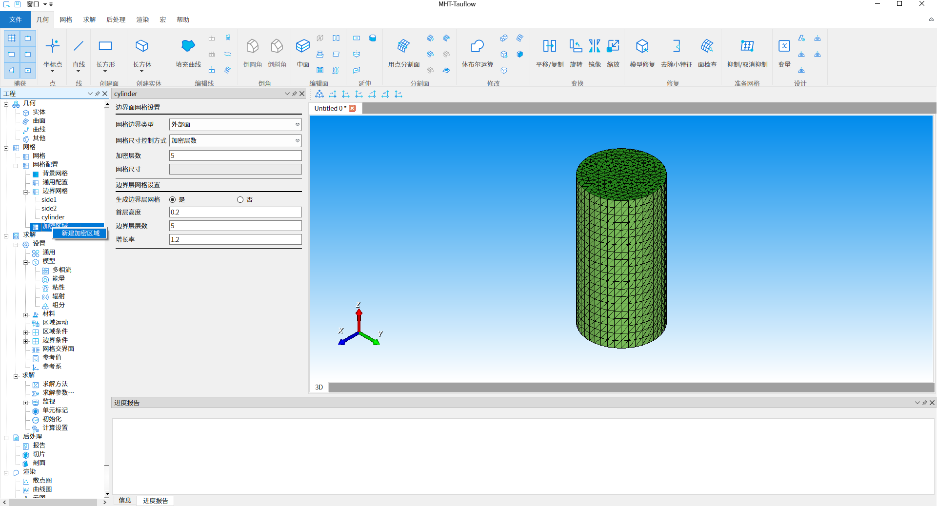 选择工程树结构【网格- 网格配置- 加密区域】节点,单击鼠标右键,弹出右键菜单,选择『新建加密区域』选项,如下图10所示