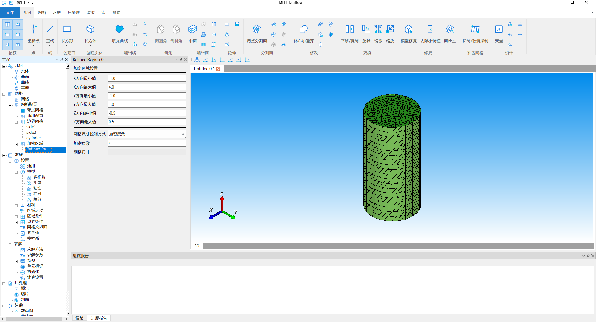 双击工程树结构【网格-网格配置-加密区域-Refined Region-0】节点,此处使用默认参数进行加密区域设置,如下图11所示