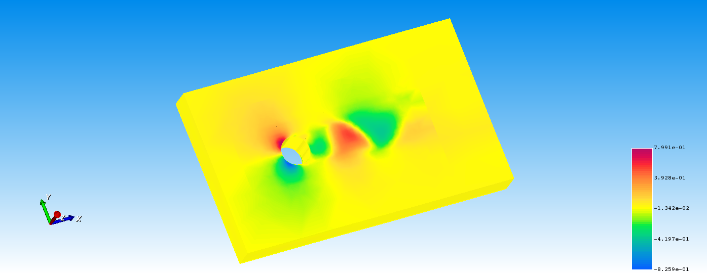 圆柱的直径为1m,计算区域为10×6×1m。圆柱绕流本是用CFD的一个经典问题,通常用于不同雷诺数下的尾涡脱落频率与平均升阻力。该问题雷诺数Re=200。